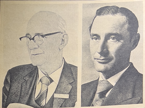 For rugged individualism in the field of eye-catching neckwear, no public figure in South Africa has ever matched Mr. Jim Fouché, the Minister of Agricultural Technical Services and Water Affairs (far left). The fist-sized knot in his ties is probably unique and has been the subject of comment wherever "Oom Jim" has appeared in public or has had his photograph published. Only a man who has confidence in his position in society and public affairs would ignore convention the way he has done with the way-out knot that covers so much of his shirt-front. With this exception, Mr. Fouché is conservative in his dress and qualifies as one of the better-dressed members of the Government. The Minister's son, Mr. "Buks" Fouché, until recently South Africa's Ambassador to the Netherlands, shows that in the style of his neckwear "the apple does not fall far from the tree," as they say in the Free State.
