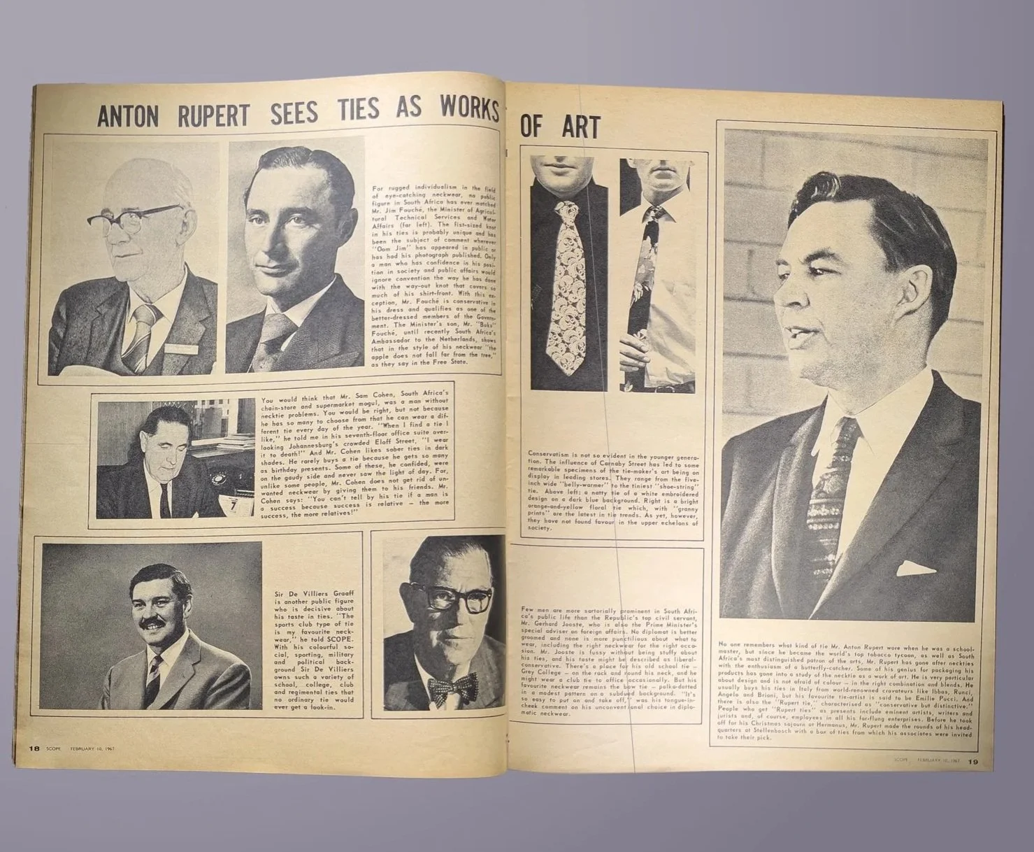 “No one remembers what kind of tie Mr. Anton Rupert wore when he was a school master but since he became the world’s top tobacco tycoon, as well as South Africa’s most distinguished patron of the arts, Mr Rupert has gone after neckties with the enthusiasm of a butterfly catcher”.